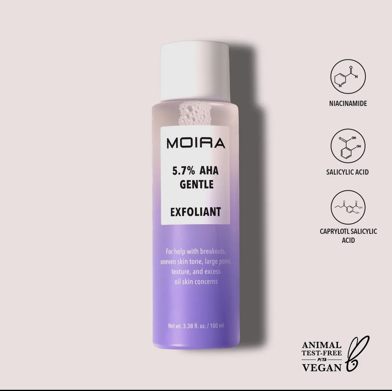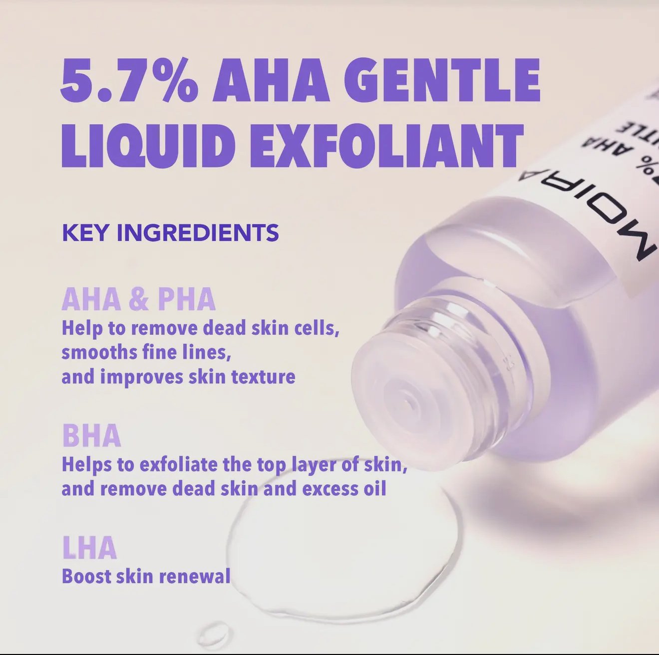 El exfoliante suave MOIRA con 5.7% de AHA es un tratamiento de peeling líquido potente pero suave que ayuda a crear una piel más brillante y de aspecto más saludable. Este tratamiento exfoliante suave contiene una mezcla única de ingredientes efectivos, que incluyen 5.7% de ácido glicólico, ácido salicílico, ácido capriloil salicílico y gluconolactona, para ayudar a eliminar las células muertas de la piel, suavizar las líneas de expresión y mejorar la textura general de la piel.